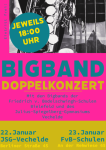 Am 22.1. erhalten wir Besuch aus der Ostwestfalen-Metropole. Die Bigband der Friedrich von Bodelschwingh-Schulen Bielefeld besucht uns für ein gemeinsames Konzert. In der Pause reichen Schülerinnen und Schüler des 13. Jahrgangs Snacks und Getränke. Als Special Guest begrüßen wir auch die Musiker des Bausteins Musik. Das Konzert beginnt um 18:00 Uhr, der Eintritt ist frei.