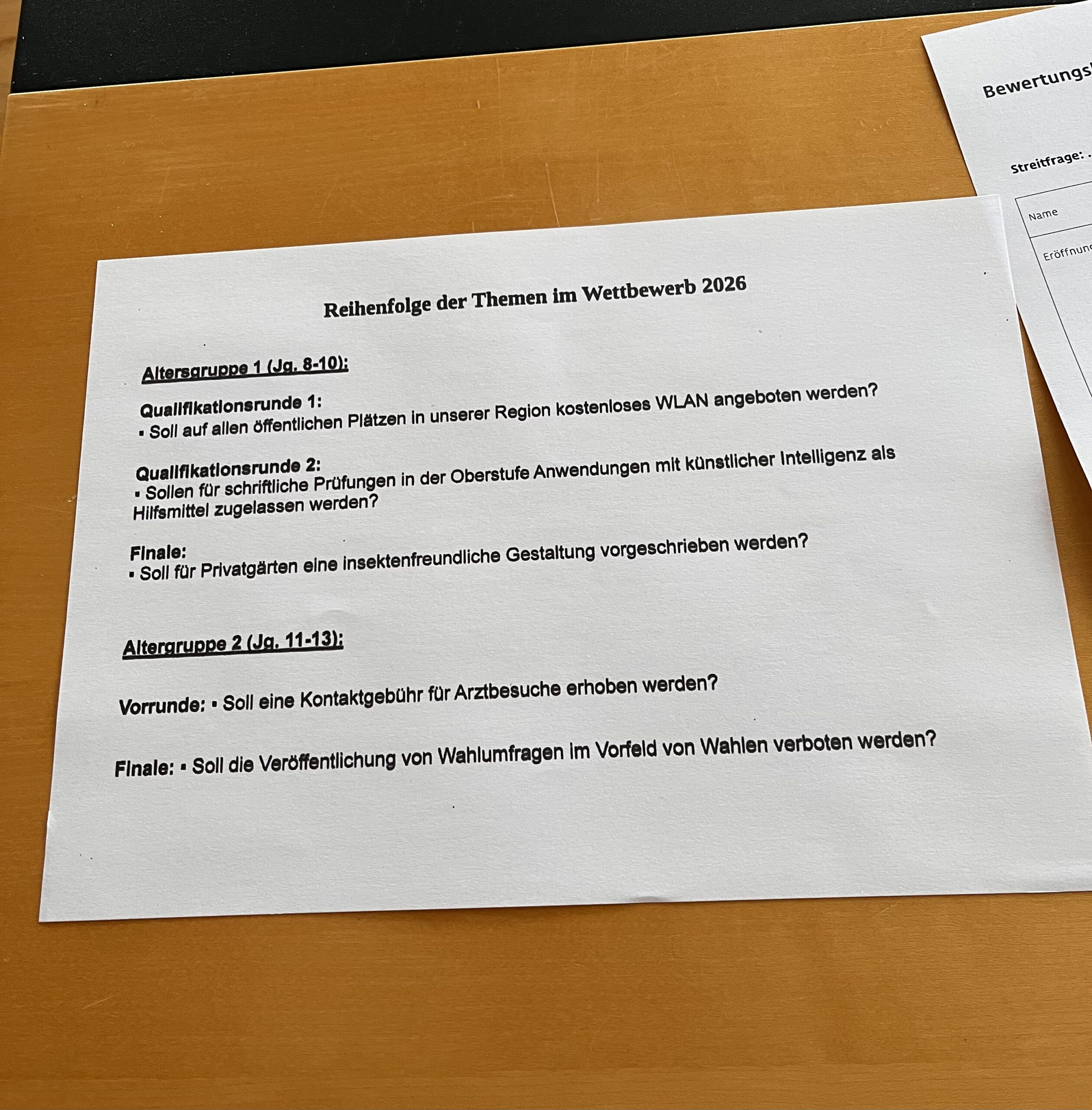 Auch in der Altersgruppe 1 (Jahrgänge 8-10) war unsere Schule erfolgreich vertreten. Henrik Schulze (9.4) und Leonhard Peters (9.2) qualifizierten sich als Schulsieger für den Regionalwettbewerb. Dort schlugen sie sich wacker, sammelten wertvolle Erfahrungen und zeigten eindrucksvoll, wie viel Debattierfreude und Können bereits in den jüngeren Jahrgängen steckt.